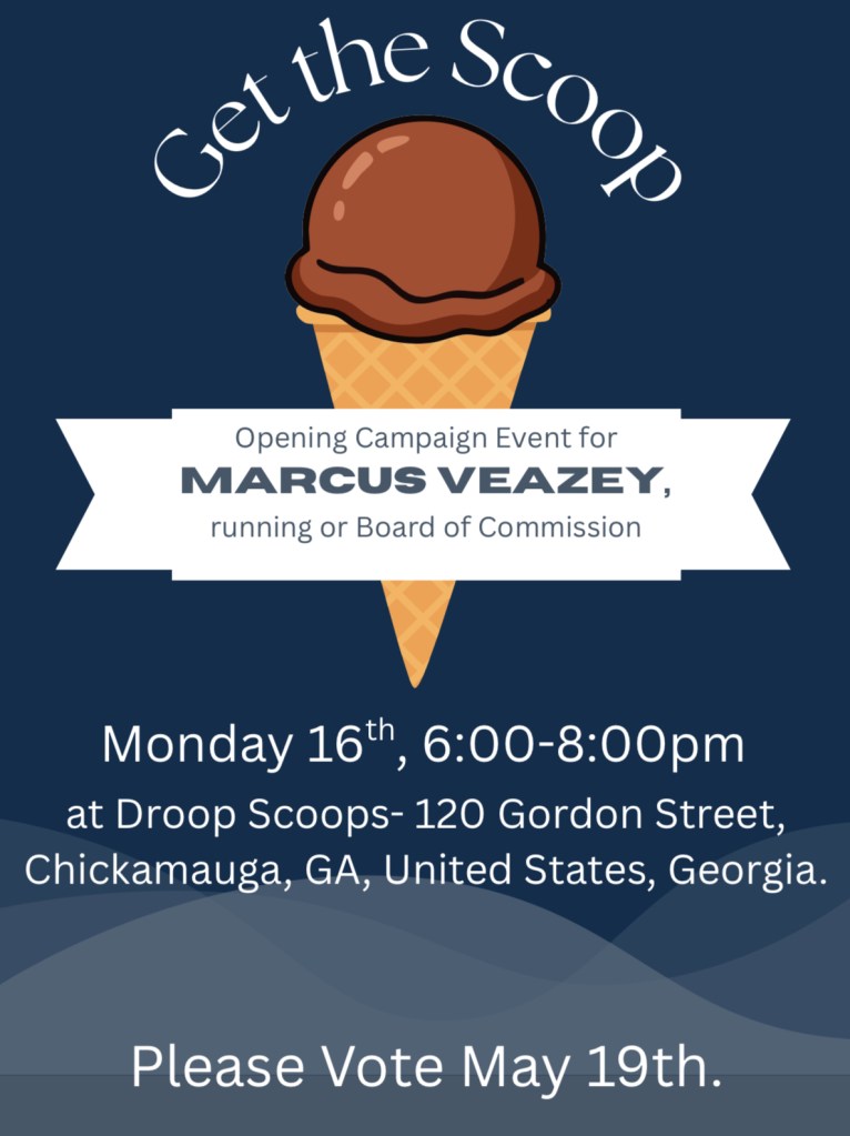 On March 16, 2026 we held an event, “Get the Scoop”, at Droop Scoops in Chickamauga for friends, family, and supporters. Marcus kicked off his campaign with an informative speech and was able to spend time talking to new supporters, as well as visiting with friends. Everyone enjoyed the delicious food and tasty ice cream as we were reminded to vote on May 19! Thanks to Jerry and Marla Prince for the use of their facility. Also, much appreciation goes to all those who helped bake, set up, serve, and clean up! We are grateful to you all.